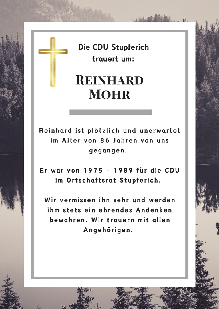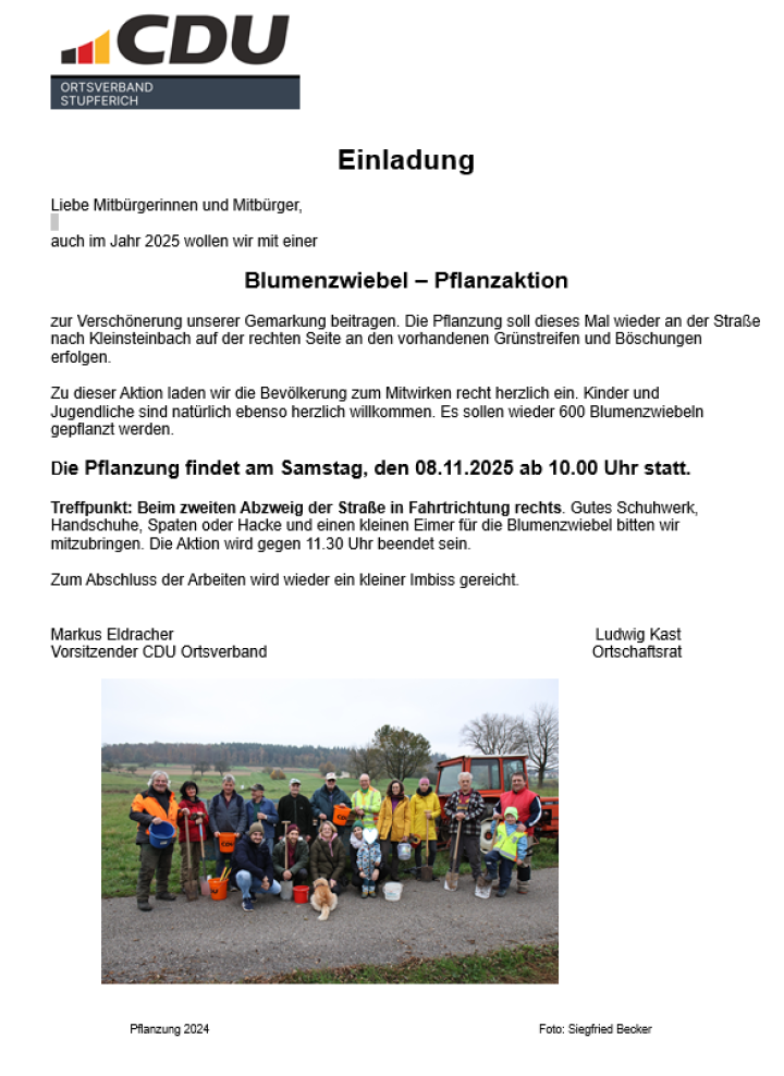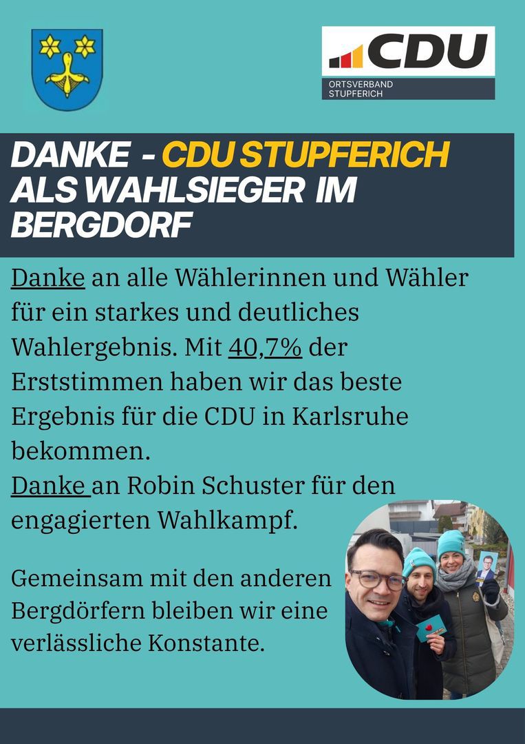 Die CDU Stupferich setzt sich ein für die Interessen unseres schönen Höhenstadtteils und seiner Bewohnerinnen und Bewohner.Hierzu brauchen wir das Engagement von vielen Stupfericher Bürgerinnen und Bürgern, auch von denen, die noch nicht solange in unserem Bergdorf wohnen.Besonders freuen wir uns auch über das Interesse unserer jungen Menschen.Teilen Sie uns Ihre Fragen, Wünsche und Anregungen mit.Sparen Sie bitte auch nicht mit Kritik wo sie aus Ihrer Sicht berechtigt ist. Nur wenn wir wissen wo Sie der Schuh drückt, können wir Ihre Interessen vertreten.Wichtig ist uns auch eine gezielte Öffentlichkeitsarbeit und die Vertretung unserer Stupfericher Belange in der Gesamtstadt.