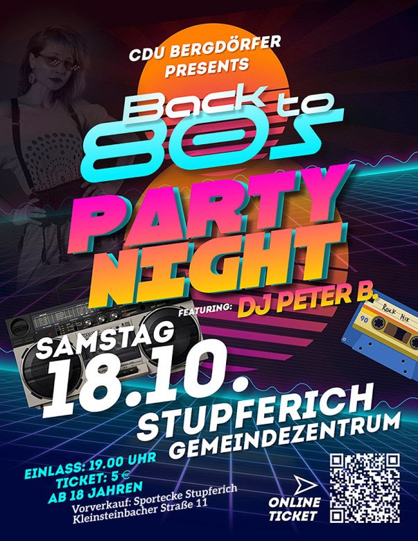 Am Samstag, den 18. Oktober 2025, heißt es im Gemeindezentrum Stupferich: Zurück in die 80er! Taucht ein in eine unvergessliche Zeitreise voller Neonfarben, Retro-Sounds und legendärer Party-Hits.